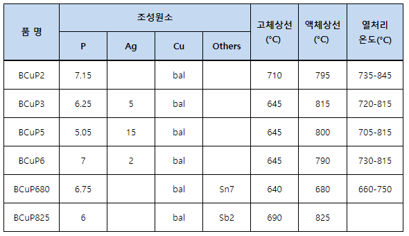 : 동에 인을 첨가하여 융점을 낮게한다. Ag, Sn등을 첨가하여 가공성, 퍼짐성을 좋게 하고 유동성을 향상시킬 수 있다. 기계적 강도가 높으며 내식성이 좋아 선박, 열교환기등에 사용된다.