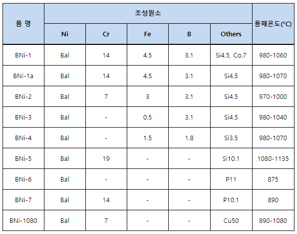 : 니켈 브레이징 용가재는 고온강도가 높고, 내식성 및 고온 내산화성이 우수하므로 항공기, 각종 엔진, 터빈, 원자로 등에 사용된다.