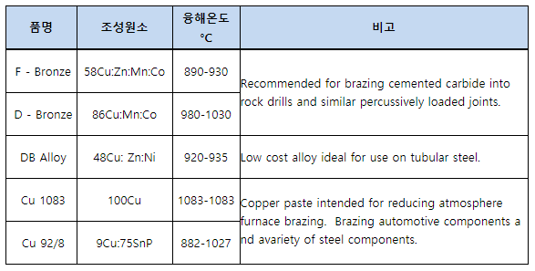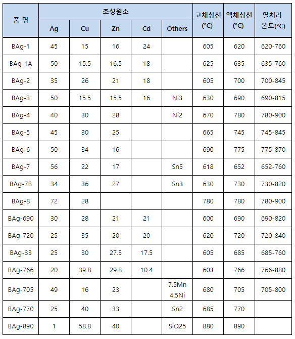 : 은합금 브레이징 용가재의 주성분은 Ag, Cu, Zn 이며, 용도에 따라 Cd, Ni, Sn, Mn, In등이 첨가된다.