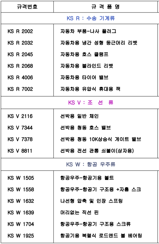 대략적인 KS 규격 목록이다. KS 규격목록의 전체는 방대하기 때문에 일부 자주쓰는 KS 규격을 알아본다.