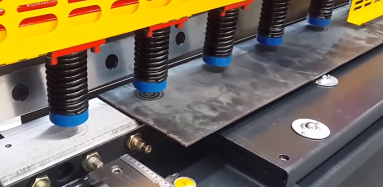 : 샤링은 가장 많이 사용되는 절단 가공 방식중의 하나로 단순하게 철판을 일정 사이즈로 재단 하는 방법이다. 상하의 칼날 가운데 소재를 밀어넣고 스위치를 누르면 상날이 길로틴처럼 내려와 철판을 자른다.