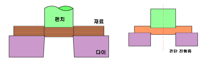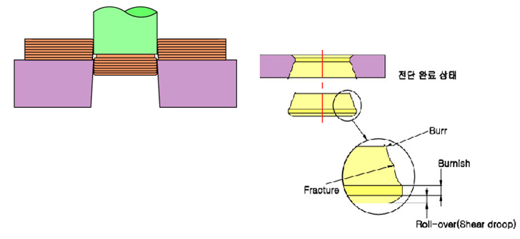 : 전단이 진행되면 될 수록 펀치와 다이날끝에 응력이 집중되면서 파단이 발생되면서 소재가 완전히 전단된다.