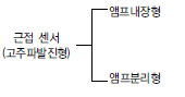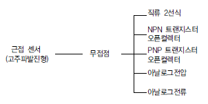 근접 센서의 종류에는 검출원리에 따라 관전센서, 유도형, 정전용량형, 초음파형으로 분류할 수 있다.