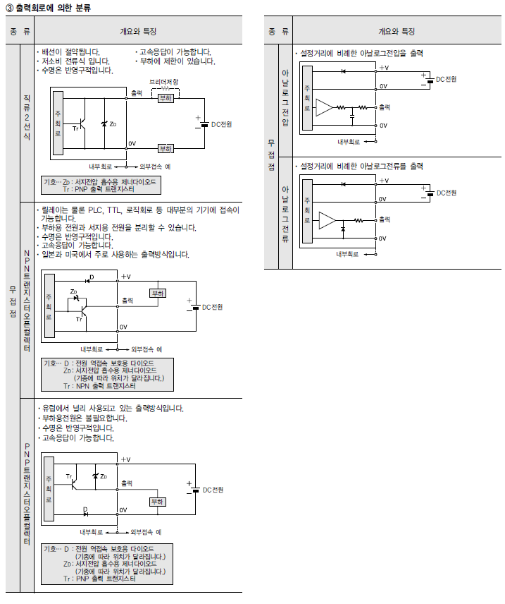 : 출력회로의 차이 및 전원전압의 차이에 따라 구분. 센서의 출력을 접속하는 기기나 장치의 입력조건에 대하여 어떤 기종이 적합한지를 선택하는 경우에 필요.