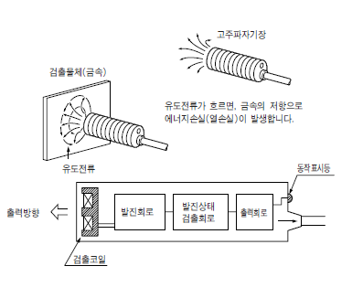 아래 그림과 같이 자기장 내부로 금속물체가 들어오면 와전류가 흐르고, 열손실이 방생한다. 이 변화를 발진회로의 발진 주파수 또는 발진진폭의 변화로 출력한다.