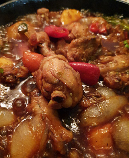 7. 데친 닭에 준비한 양념을 붓고 닭육수 또는 물을 1컵 넣고 끓인다.
