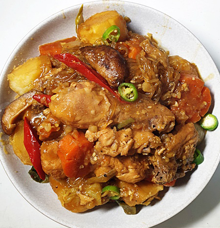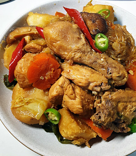 9. 중불에서 뚜껑을 닫고 40분~60분 끓여준다. 이때 중간중간 간을 보고 너무 짠것 같으면 닭육수 또는 물을 첨가하여 간을 맞추도록 한다. 달게 하고 싶으면 올리고당을 조금 첨가하여도 좋다. 당면은 완성되기 5분~10분 전에 넣어준다.