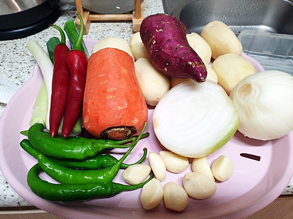 4. 야채를 다듬는다. 야채는 감자 당근 양파를 필두로 고구마나 파프리카를 조금 넣어도 좋다.