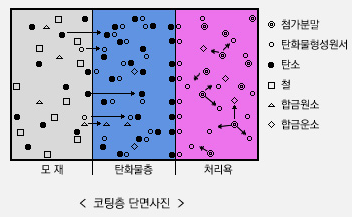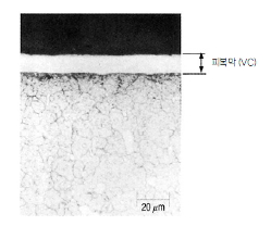 TD 처리는 950~1050도의 바냐듐 염욕제에 0.5~10시간 담궈 제품에 있는 탄소 (C) 성분과 함께 확산 결합 반응을 일으켜 우수한 코팅막을 형성하는 코팅 방법입니다.